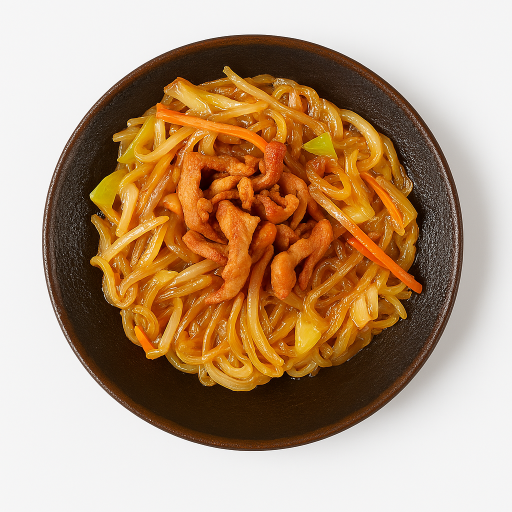 Стеклянная японская лапша готовится со свежими овощами в пряном остром соусе Карри, и подается с кусочками курицы либо свинины (по желанию), обжаренными до аппетитного хруста.